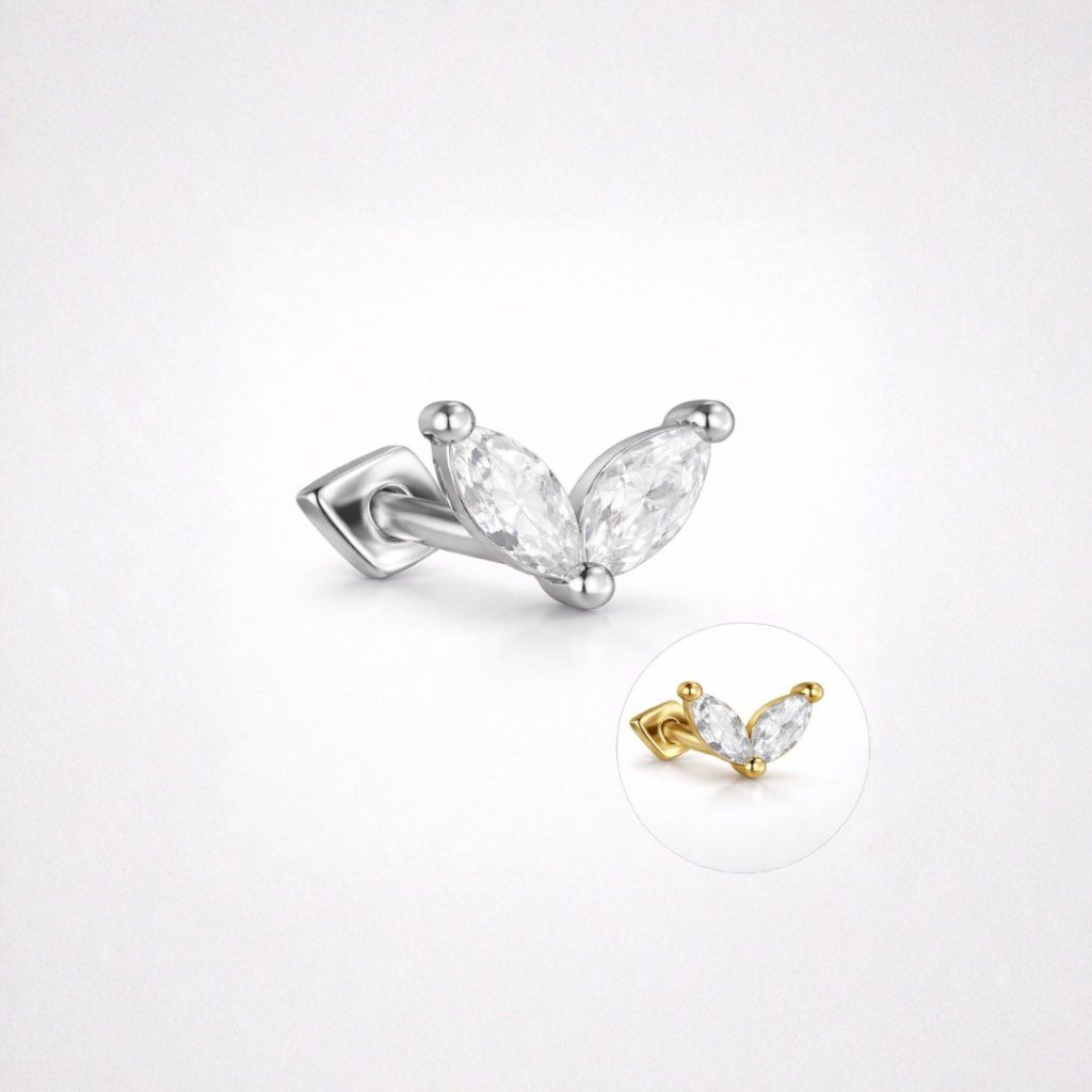 Detail, který ti přiroste k srdci. Tahle stříbrná labreta s motivem dvou lístků ve tvaru „V“ působí velmi jemně, ale zároveň dokonale zvýrazní linii ucha. Zirkony na povrchu lístků chytají světlo s každým pohybem a dodávají šperku přírodní třpyt, který působí svěže a žensky.