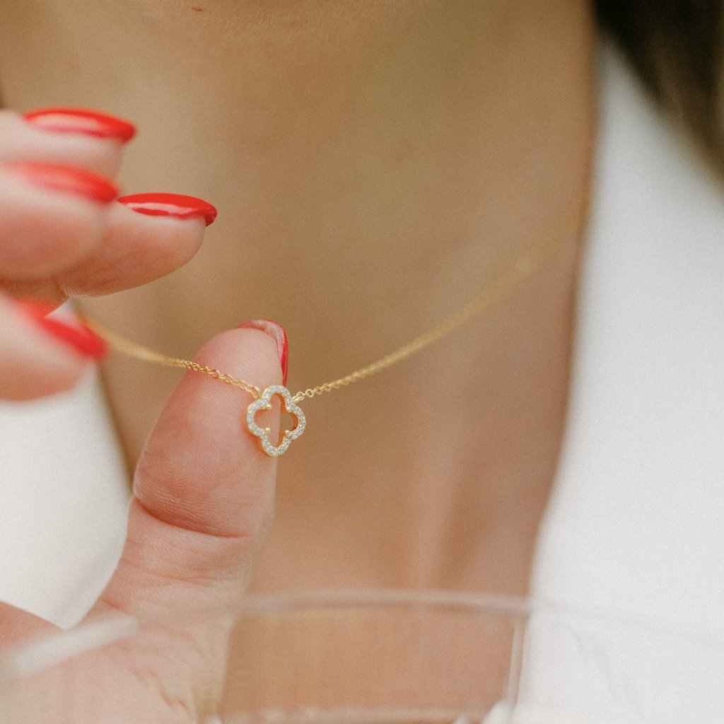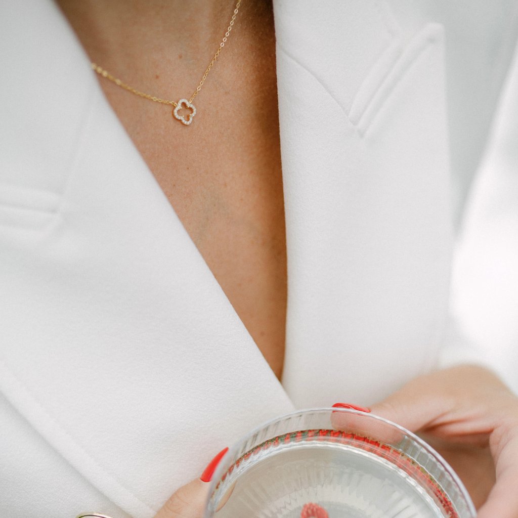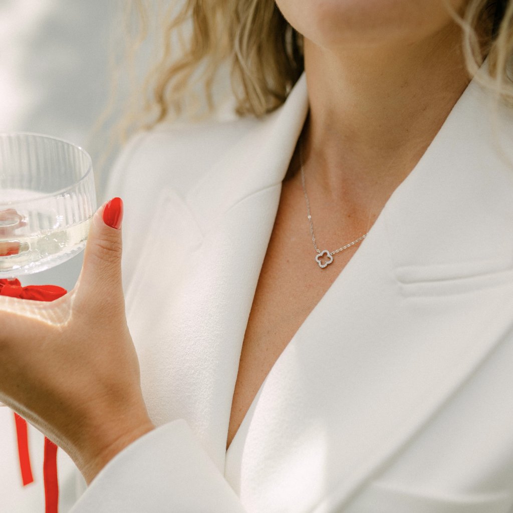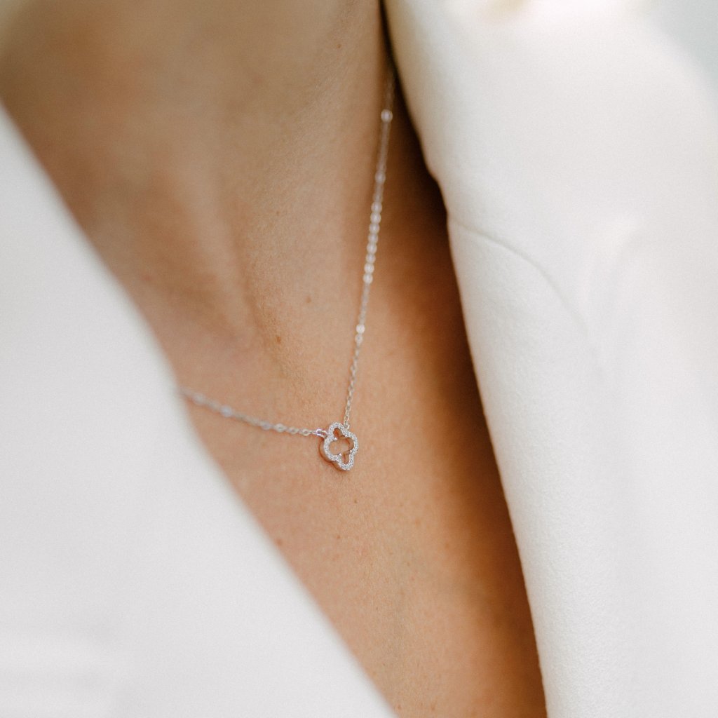 Elegantní náhrdelník s jemným přívěskem čtyřlístku v obrysu představuje stylový doplněk pro každý den. Přívěsek je po celém obvodu osazený zářivými zirkony, které dodávají šperku jemný, ale výrazný lesk.