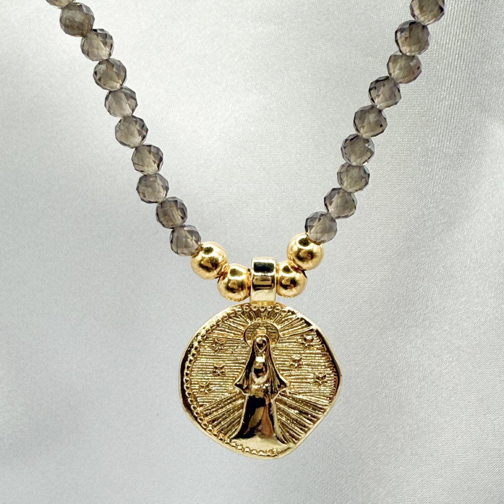 Záhněda přináší klid, rovnováhu a uzemnění, zatímco medailon s Madonou symbolizuje ochranu, lásku a vnitřní světlo.
