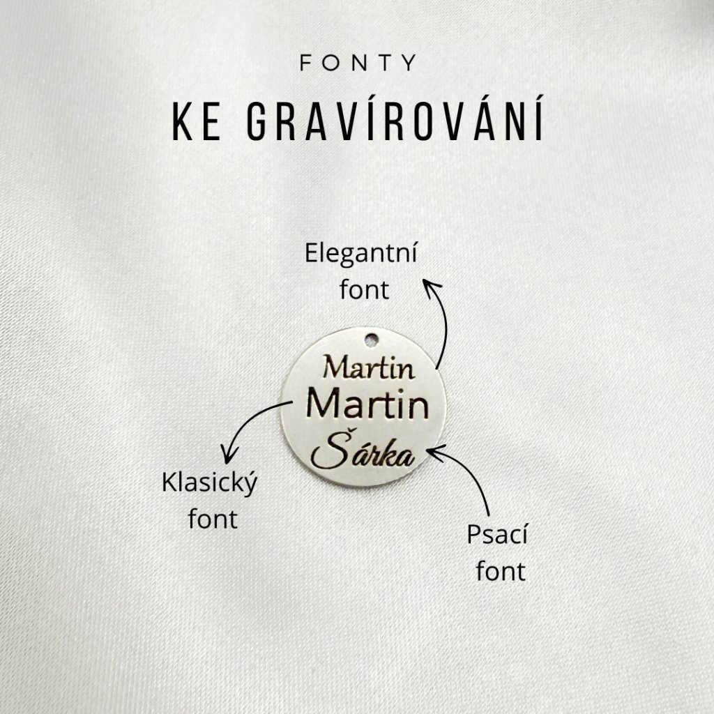 Na medailon nebo plíšek lze vygravírovat text (např. iniciály, datum, krátký vzkaz).