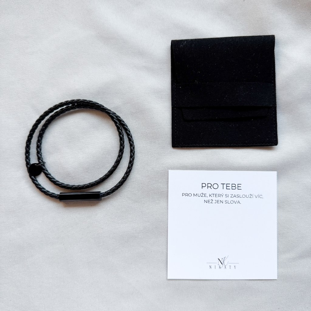 Dominantou náramku je minimalistický plíšek a kulatý medailon v tmavém kovovém provedení. Právě v plíšku je ukryto praktické zapínání, díky kterému je náramek snadno a rychle nasaditelný. Velikost je univerzální, takže padne většině mužů bez potřeby dodatečného nastavování.