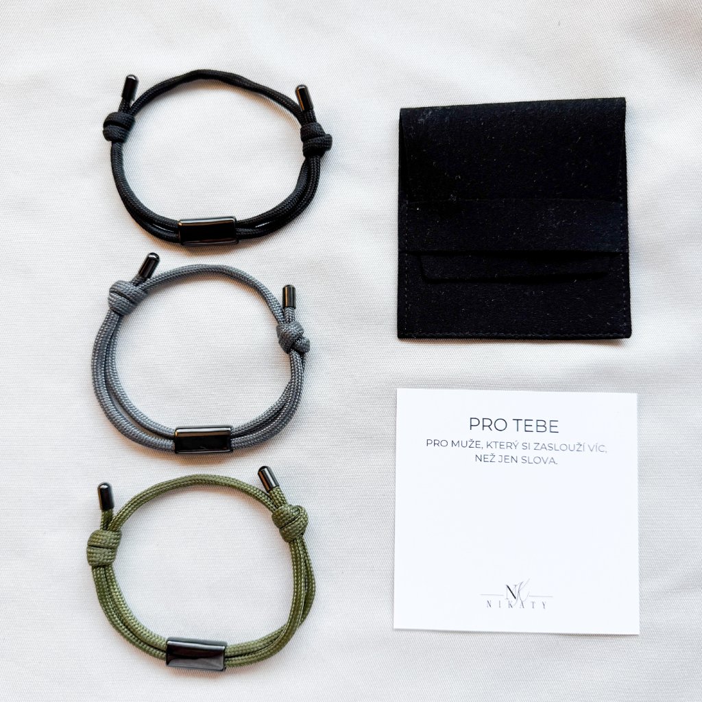 Tento pánský náramek v moderních barvách kombinuje jednoduchý design s praktickým provedením. Náramek skvěle drží tvar a pohodlně se nosí po celý den. Dvojitá šňůra dodává náramku výraznější vzhled a decentní kovové prvky působí elegantně a nadčasově.